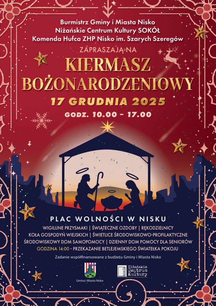 Kiermasz Bożonarodzeniowy na Placu Wolności w Nisku odbędzie się 17 grudnia 2025 r., w godzinach od 10.00 do 17.00, a na mieszkańców czeka świąteczna atmosfera i moc smaków. Wydarzenie współorganizują Burmistrz Gminy i Miasta Nisko, Niżańskie Centrum Kultury „Sokół” oraz Komenda Hufca ZHP Nisko im. Szarych Szeregów.