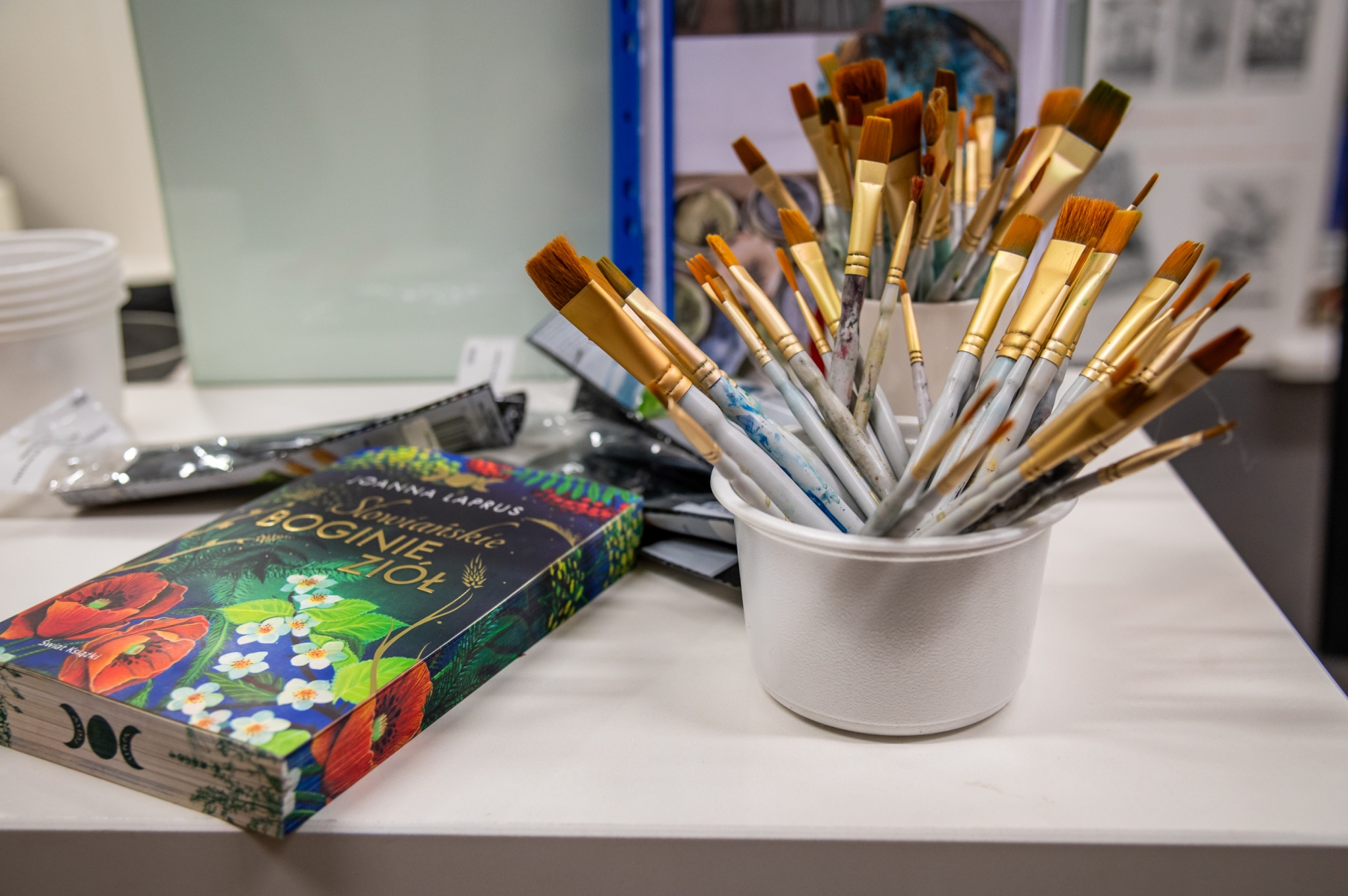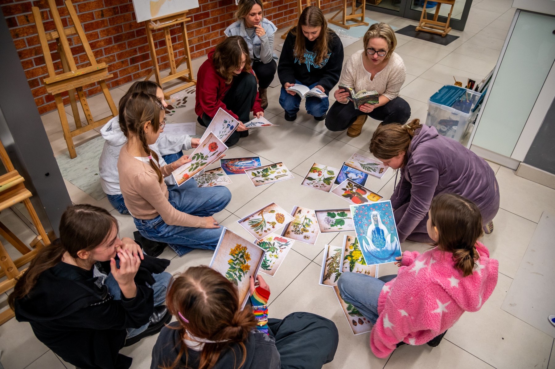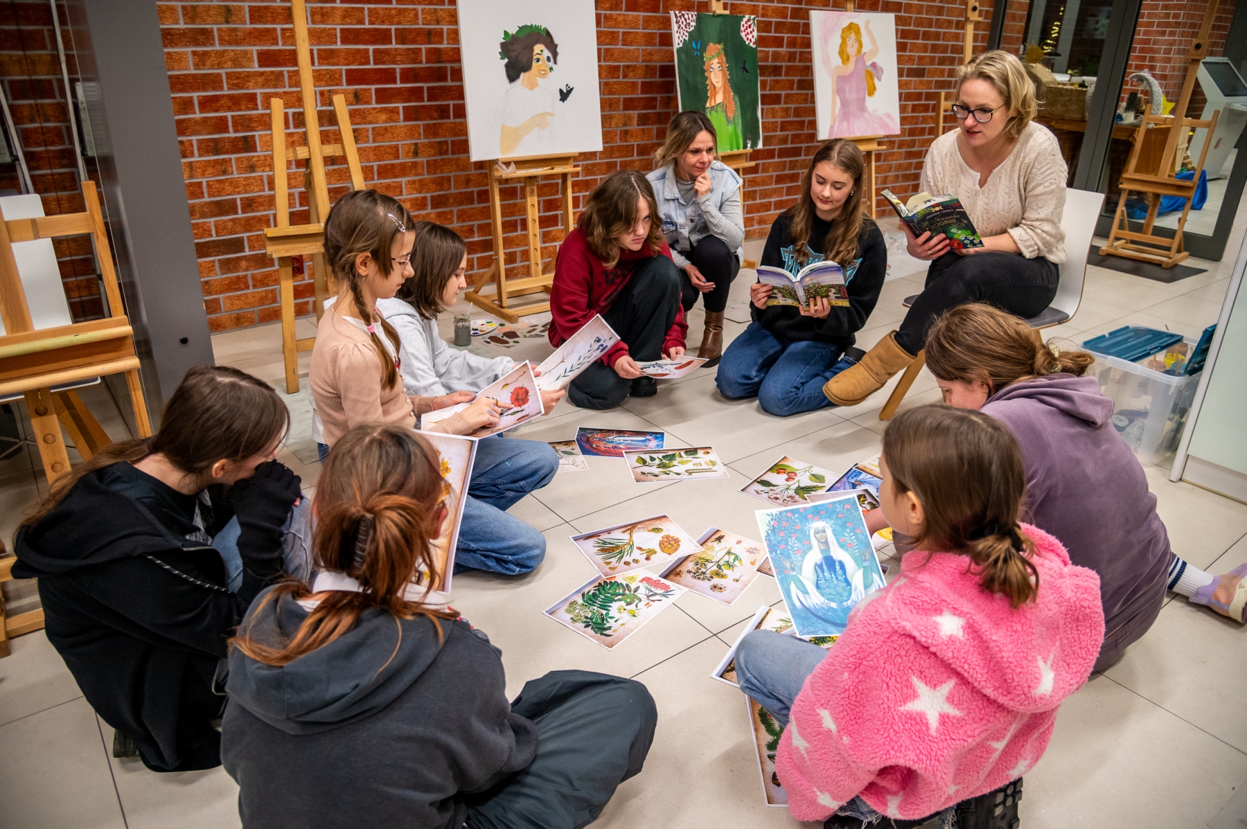 Podczas zajęć plastycznych, realizowanych w ramach projektu „Flora Fantastica – na styku sztuki i natury”, nasi młodzi plastycy pracują w różnych technikach. Malują na materiałach naturalnych, takich jak kamienie, suszone licie czy plastry drewna, pracują z tkaniną i gliną, ale także próbują swoich sił w tradycyjnym malarstwie sztalugowym. Tematyka prac jest mocno związana ze światem natury, a zwłaszcza botaniką. Jednym z ich zadań jest sportretowanie trzech słowiańskich bogiń – Dziewanny, Mokosz i Marzanny. Wiedzę na temat atrybutów, wyglądu, charakteru tych postaci młodzi twórcy czerpią między innymi z książek Joanny Laprus „Słowiańskie Boginie Ziół” i „Boginie Słowiańskich Szeptów”. Obserwujemy kolejne etapy powstawania obrazów i jesteśmy naprawdę zaskoczeni w jak ciekawy i różnorodny sposób przekładają wiedzę na język malarstwa.