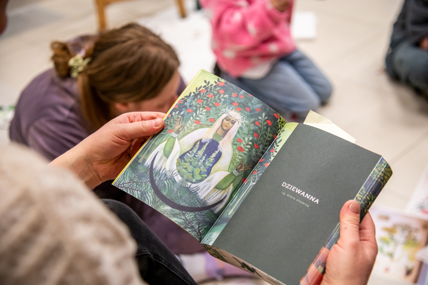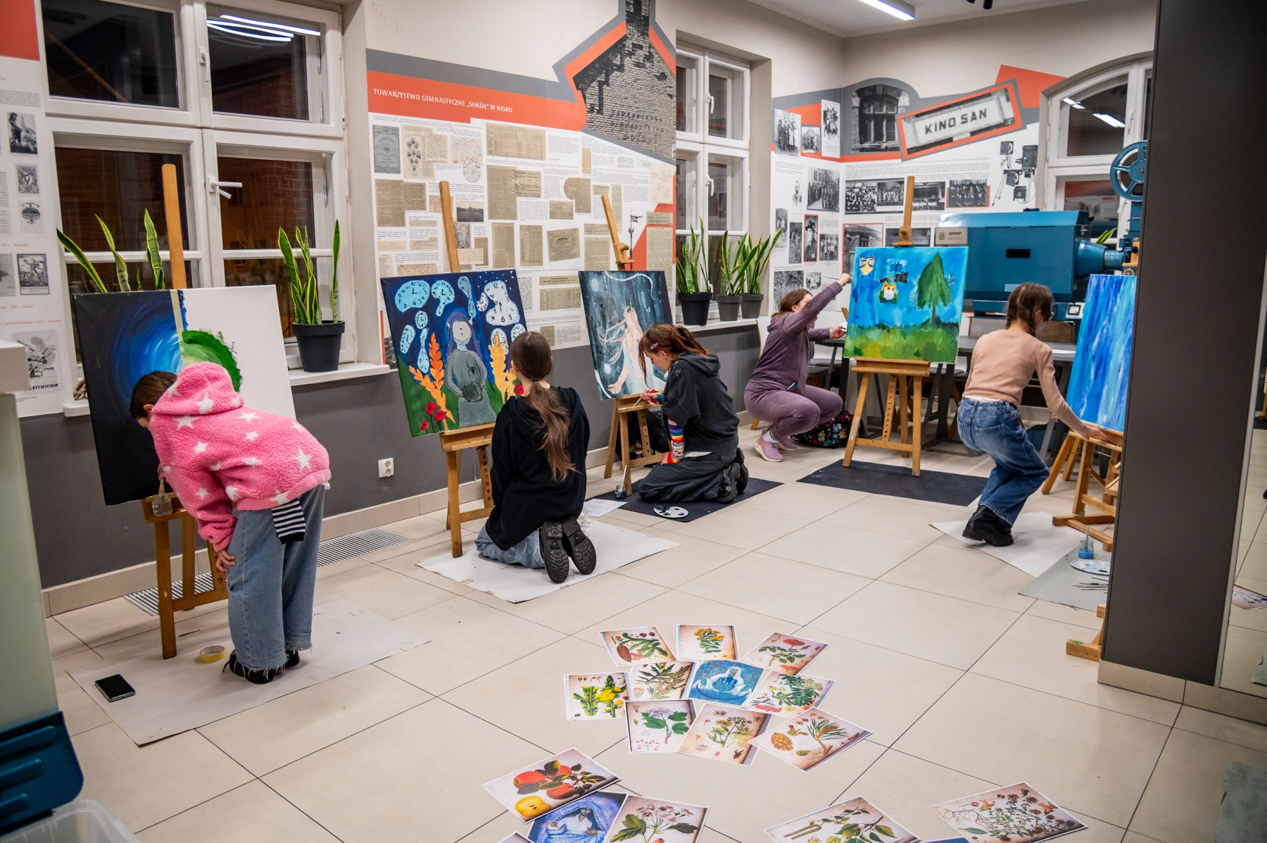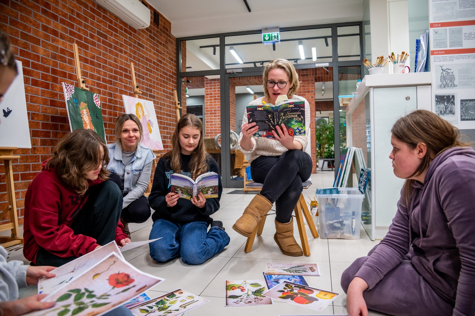 Podczas zajęć plastycznych, realizowanych w ramach projektu „Flora Fantastica – na styku sztuki i natury”, nasi młodzi plastycy pracują w różnych technikach. Malują na materiałach naturalnych, takich jak kamienie, suszone licie czy plastry drewna, pracują z tkaniną i gliną, ale także próbują swoich sił w tradycyjnym malarstwie sztalugowym. Tematyka prac jest mocno związana ze światem natury, a zwłaszcza botaniką. Jednym z ich zadań jest sportretowanie trzech słowiańskich bogiń – Dziewanny, Mokosz i Marzanny. Wiedzę na temat atrybutów, wyglądu, charakteru tych postaci młodzi twórcy czerpią między innymi z książek Joanny Laprus „Słowiańskie Boginie Ziół” i „Boginie Słowiańskich Szeptów”. Obserwujemy kolejne etapy powstawania obrazów i jesteśmy naprawdę zaskoczeni w jak ciekawy i różnorodny sposób przekładają wiedzę na język malarstwa.