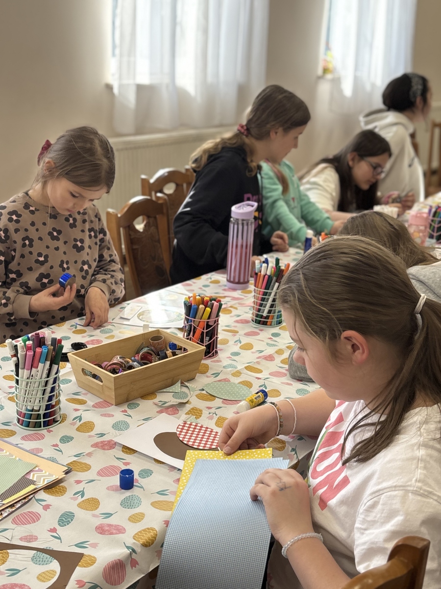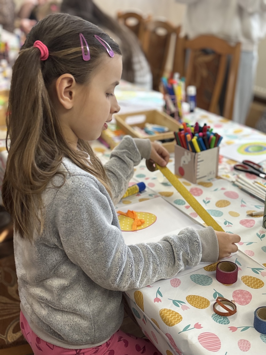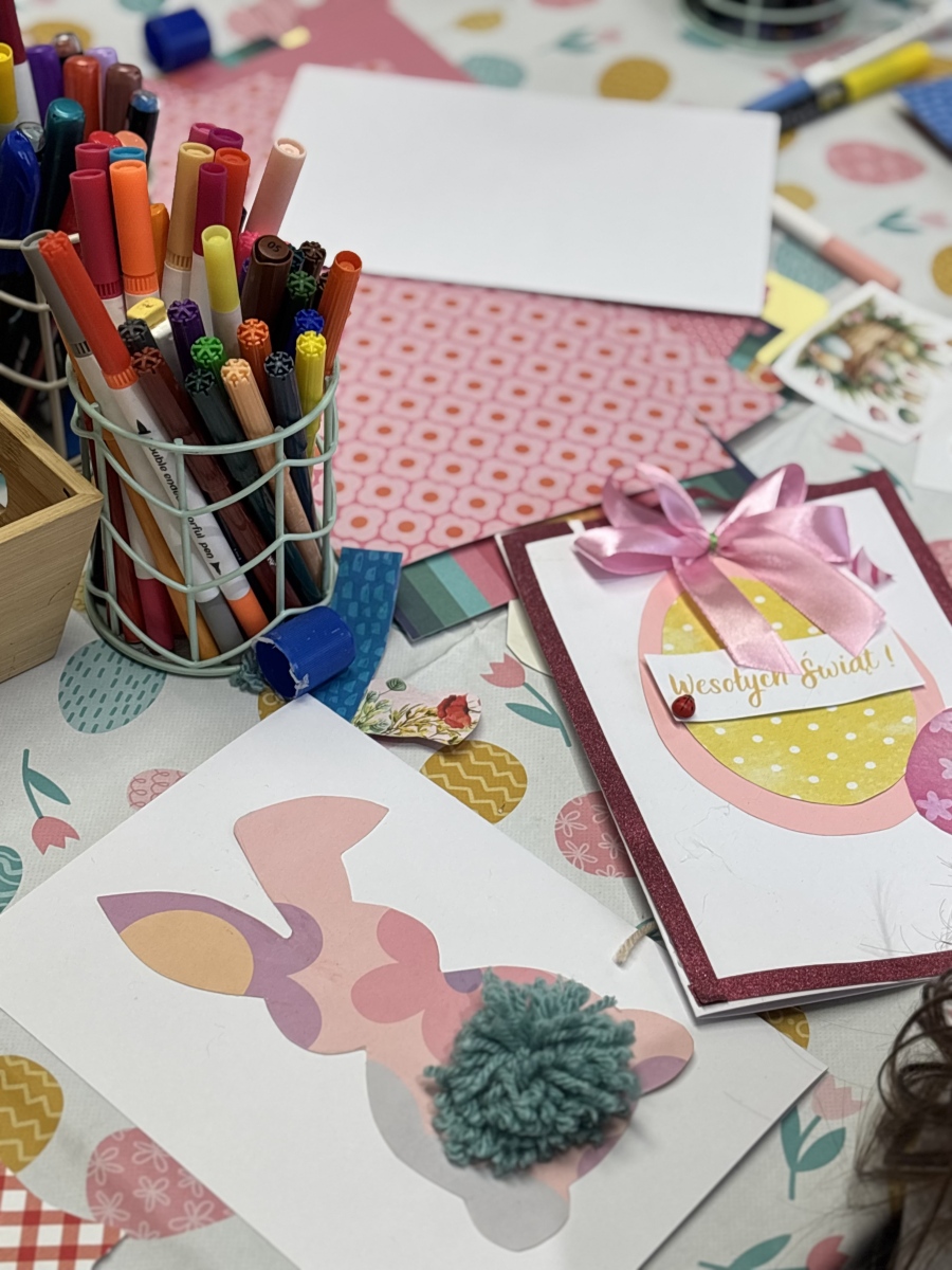 Podczas zajęć dzieci i młodzież tworzyły kartki wielkanocne z kolorowego papieru i wstążeczek. Uczestnicy wycinali różnorodne elementy dekoracyjne, takie jak pisanki, kurczaczki, zajączki czy kwiaty. Kolejnym krokiem było komponowanie ozdób na kartce – układanie ich w estetyczny sposób i przyklejanie. Na końcu każdy uczestnik wpisywał do środka własne życzenia wielkanocne.