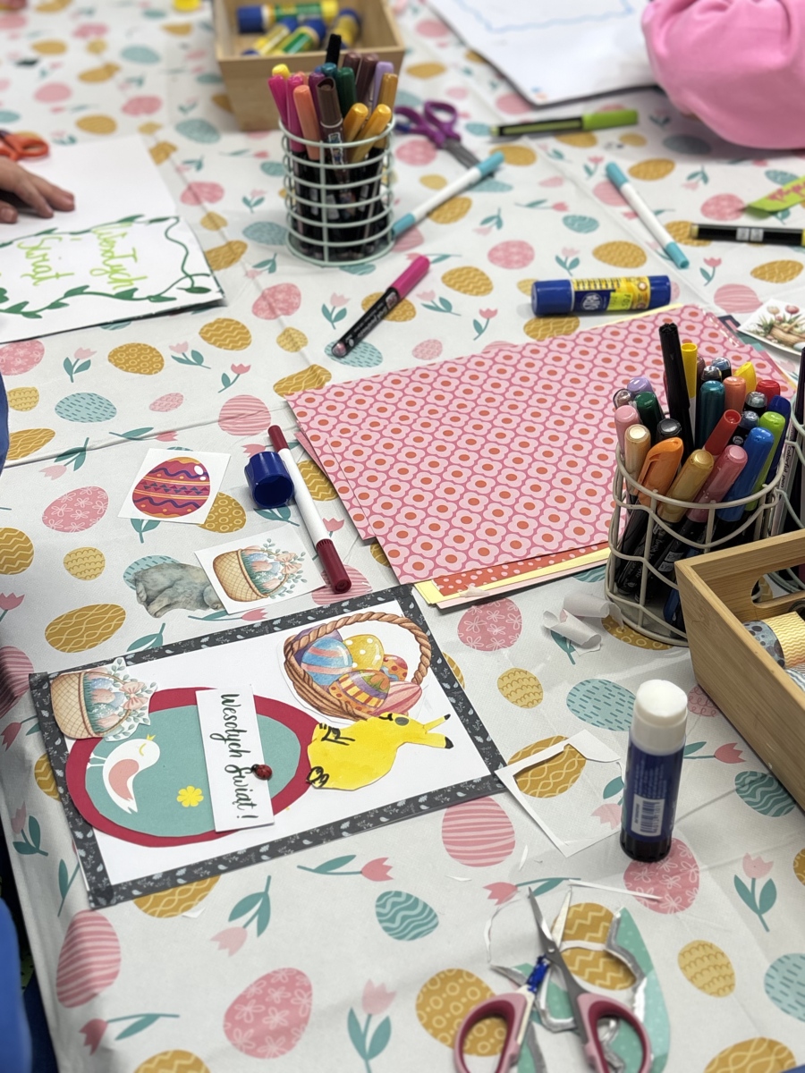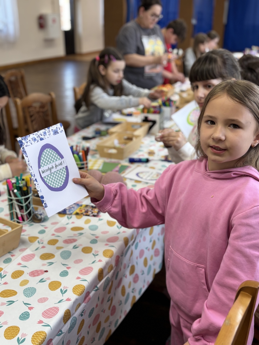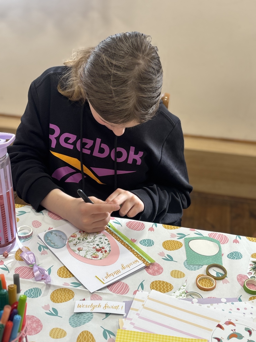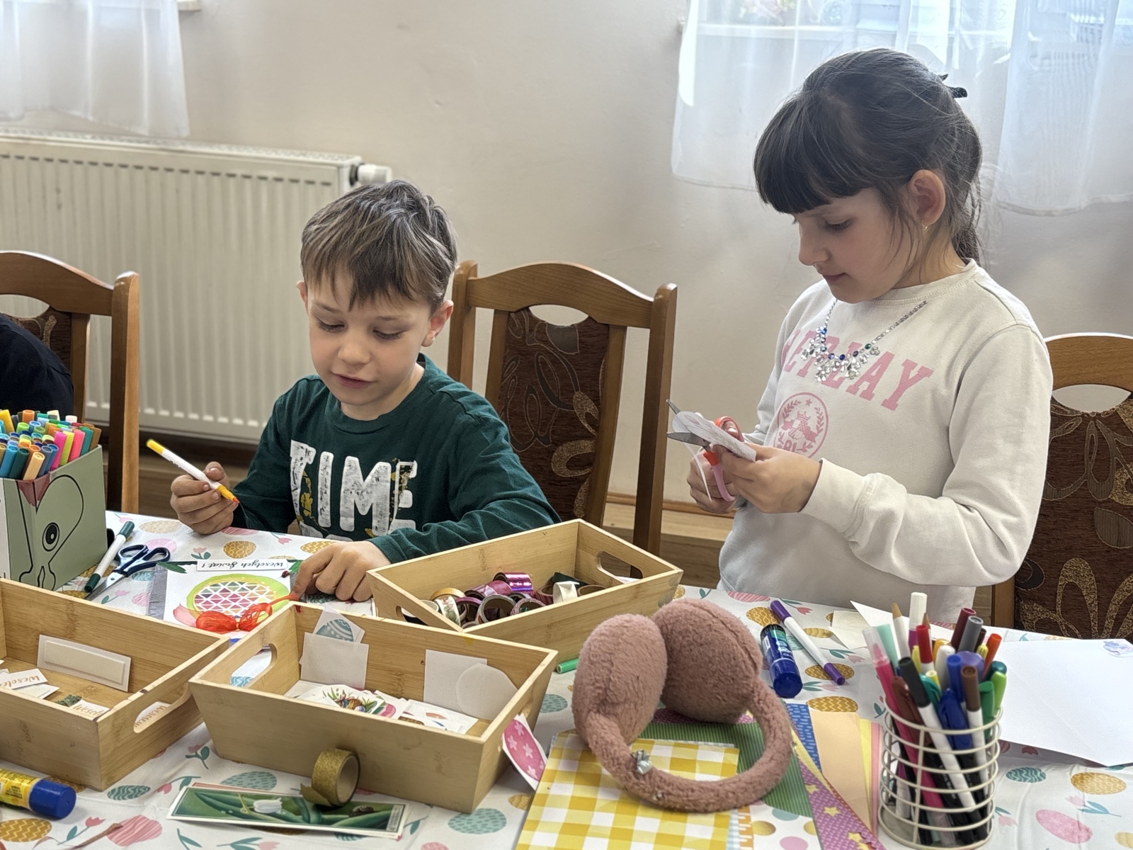 Podczas zajęć dzieci i młodzież tworzyły kartki wielkanocne z kolorowego papieru i wstążeczek. Uczestnicy wycinali różnorodne elementy dekoracyjne, takie jak pisanki, kurczaczki, zajączki czy kwiaty. Kolejnym krokiem było komponowanie ozdób na kartce – układanie ich w estetyczny sposób i przyklejanie. Na końcu każdy uczestnik wpisywał do środka własne życzenia wielkanocne.