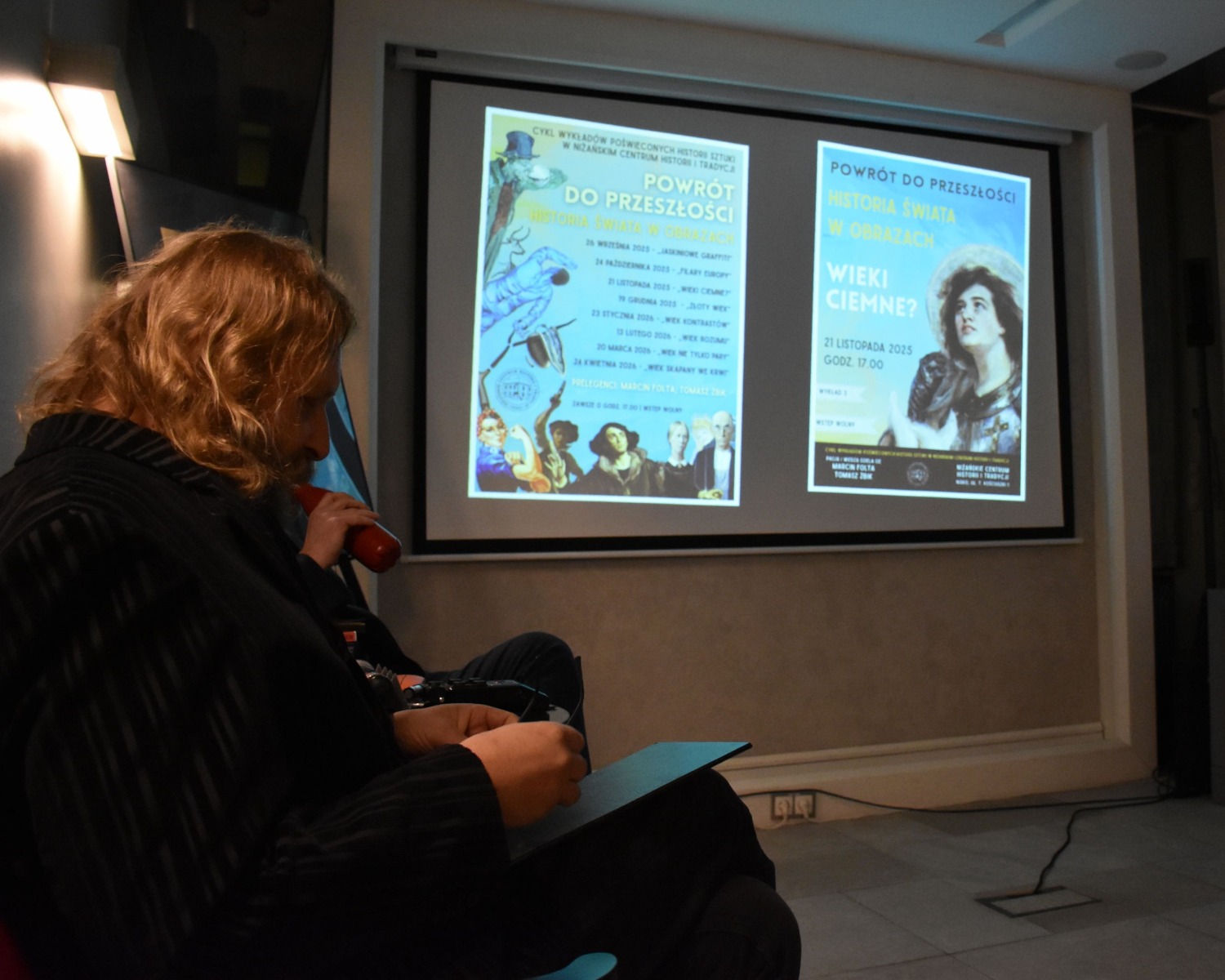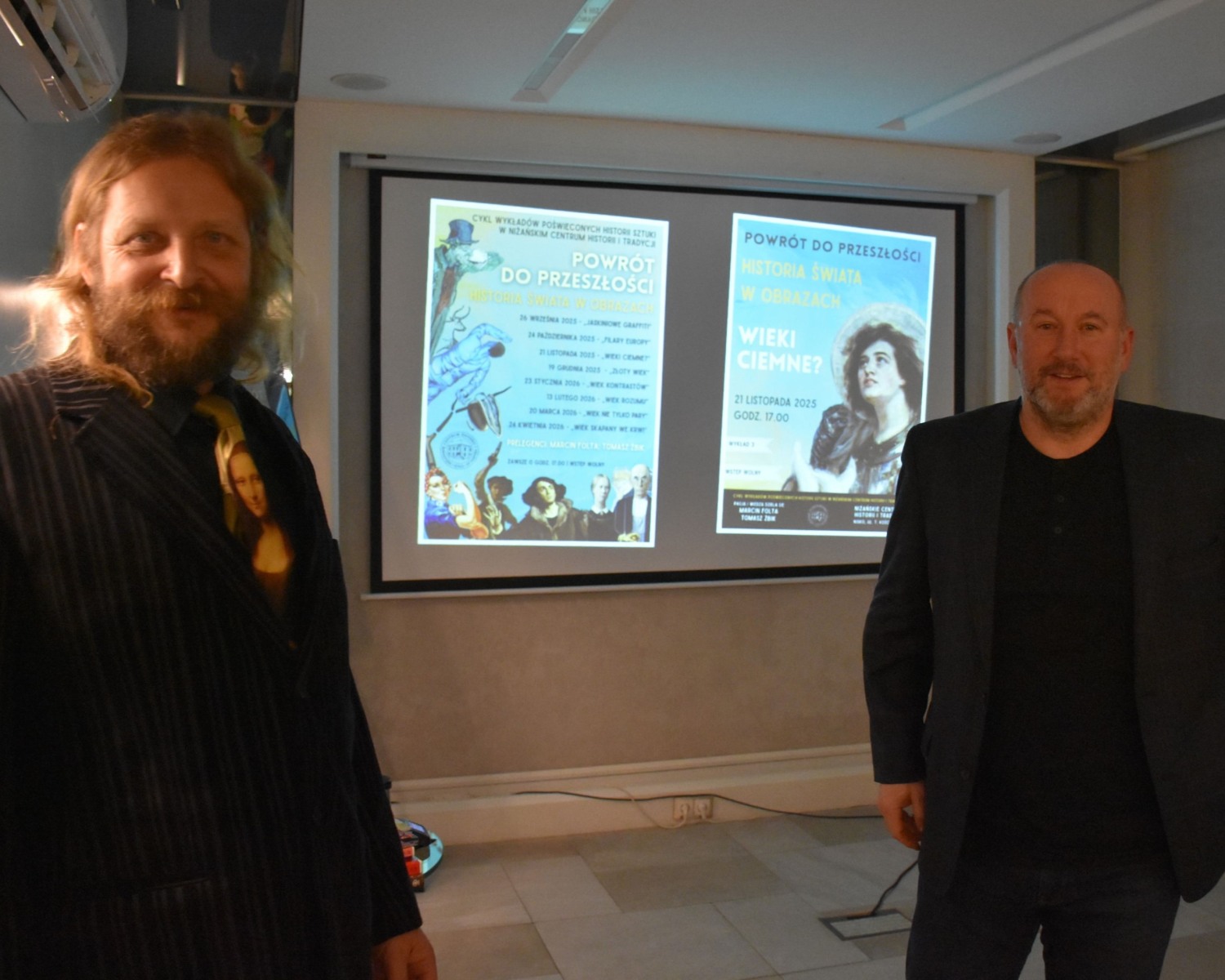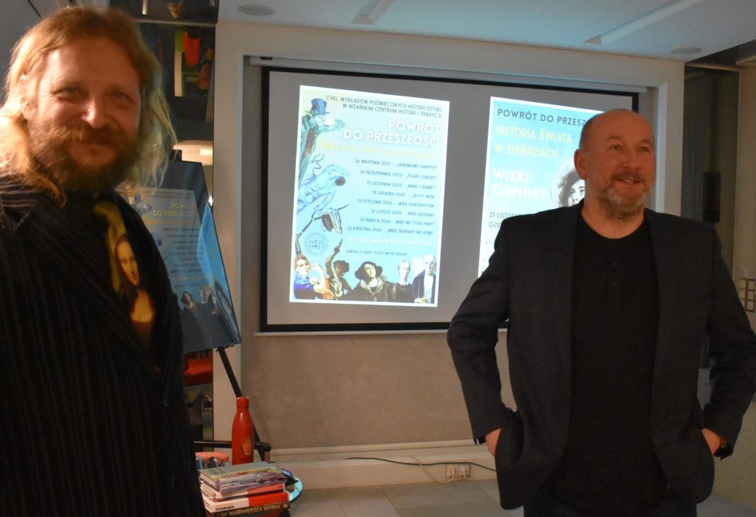 21 listopada w Niżańskim Centrum Historii i Tradycji odbyło się trzecie spotkanie z cyklu „Powrót do przeszłości – historia świata w obrazach”, zatytułowane „Wieki ciemne?”. Prowadzący, Marcin Folta i Tomasz Żbik, zabrali uczestników w podróż do średniowiecza, epoki często niesłusznie kojarzonej wyłącznie z zacofaniem i mrokiem. Frekwencja nie zawiodła – sala wypełniła się słuchaczami, którzy z zainteresowaniem śledzili opowieści o przemianach tego czasu, o narodzinach nowych idei i fundamentów współczesnej Europy. Wykład ukazał średniowiecze jako okres dynamicznego rozwoju kultury, sztuki i architektury, a także jako źródło wartości, które wciąż obecne są w naszej kulturze, języku i sposobie myślenia.