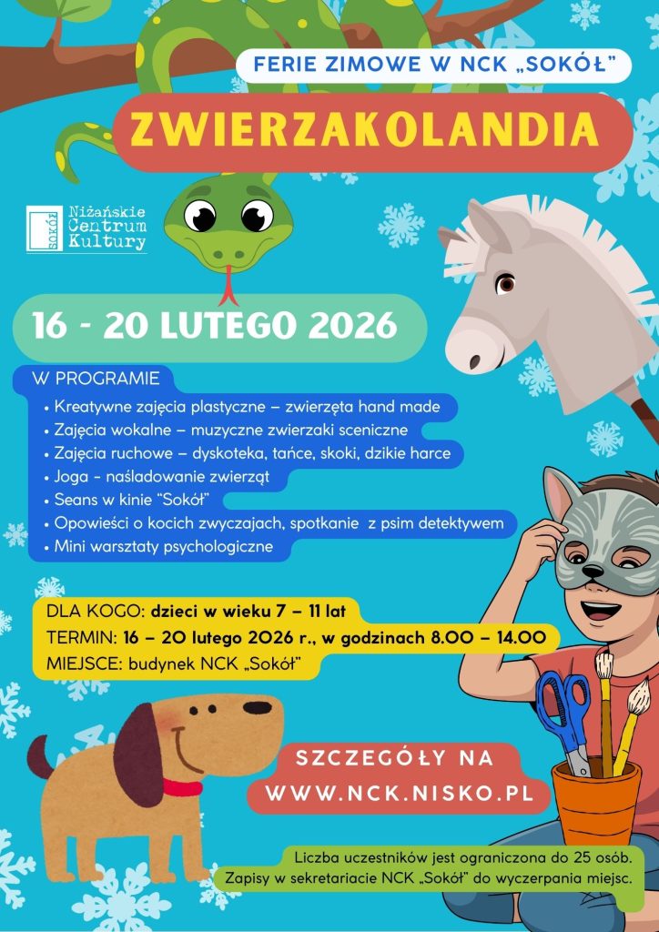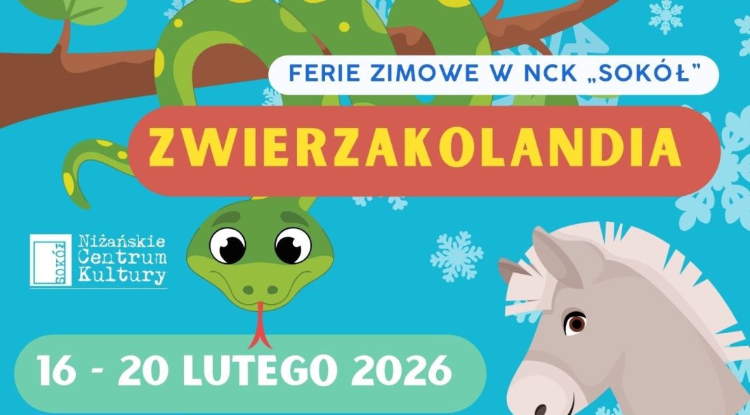 Zapraszamy na zajęcia artystyczne „Zwierzakolandia”, orgaznizowane przez NCK „Sokół” we współpracy z Niżańskim Stowarzyszeniem dla Kultury. Zajęcia odbywać się będą w terminie od 16 do 20 lutego 2026 roku w Niżańskim Centrum Kultury „Sokół”.